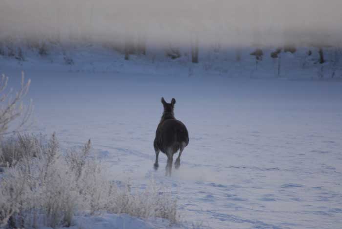 Hälge ?2009-12-18 Kallt ute och en kylig dimma, ute på ängen stod något som jag trodde var en häst. |